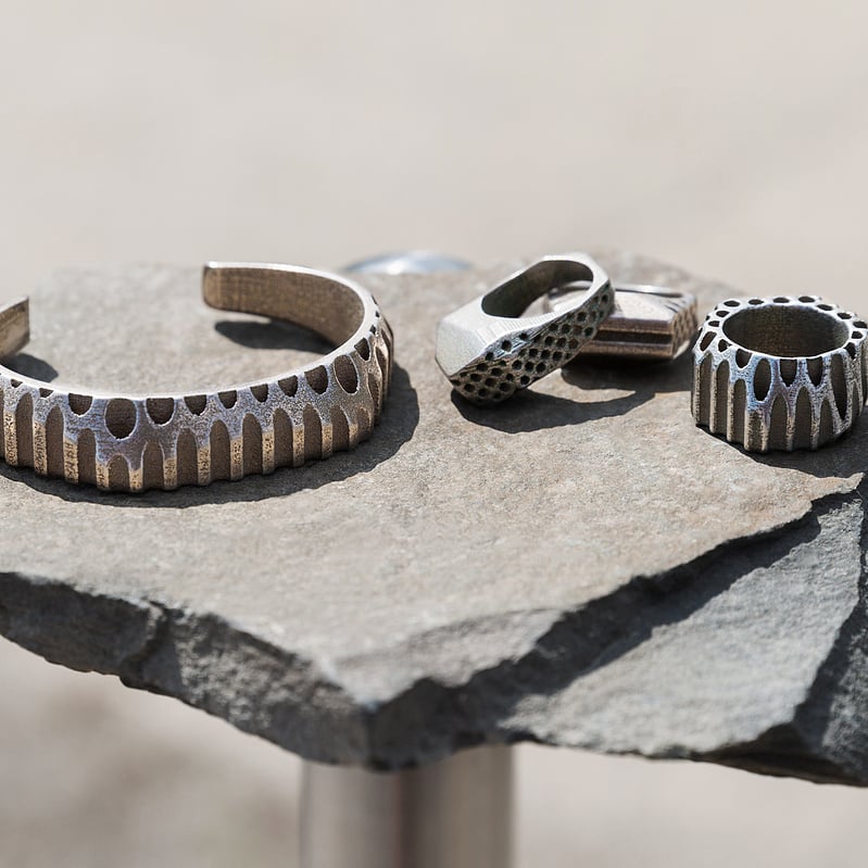 JAW Studio Column Cuff Bracelet. Available in two different 3D printed materials:
